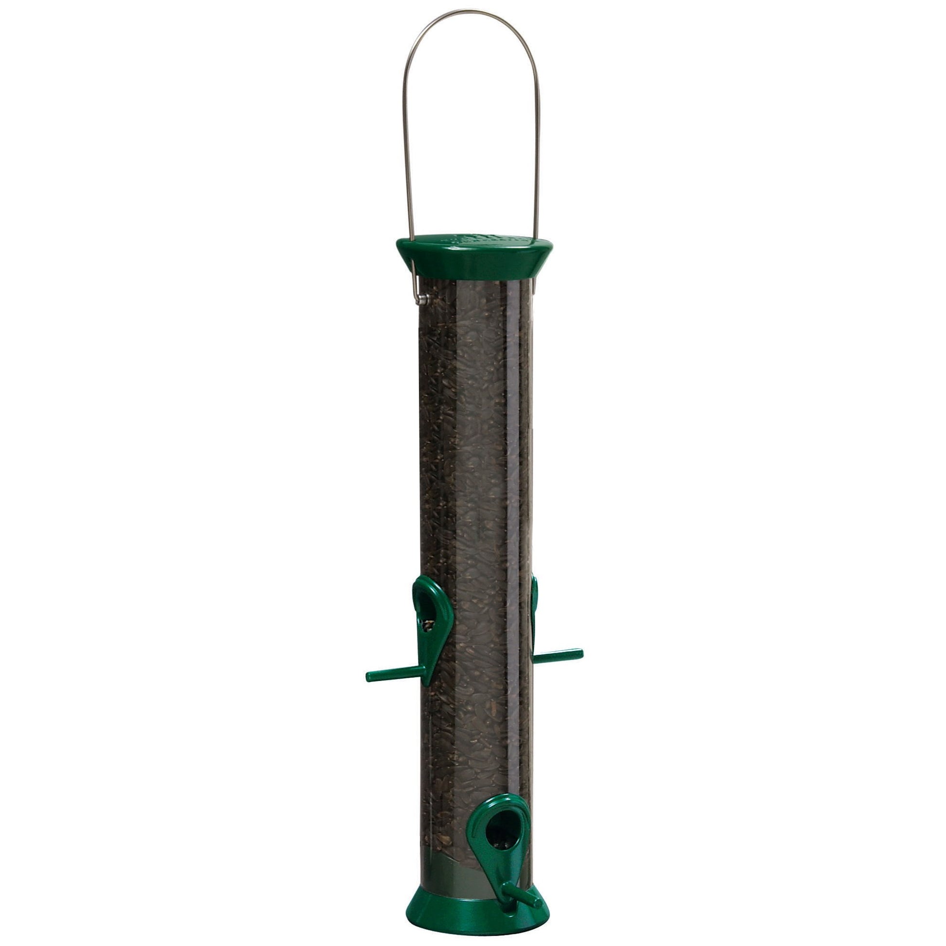 Sturdy metal parts and long-lasting UV-stabilized polycarbonate tubes. Durable powder coating. Zinc die-cast tops, bases and ports last a lifetime. Stainless steel hanging wire - squirrels can’t chew. Snug fitting sliding cap - easy for you to lift but hard for squirrels. Top easily removes for easy cleaning. Seeds flow freely over internal seed baffle.
