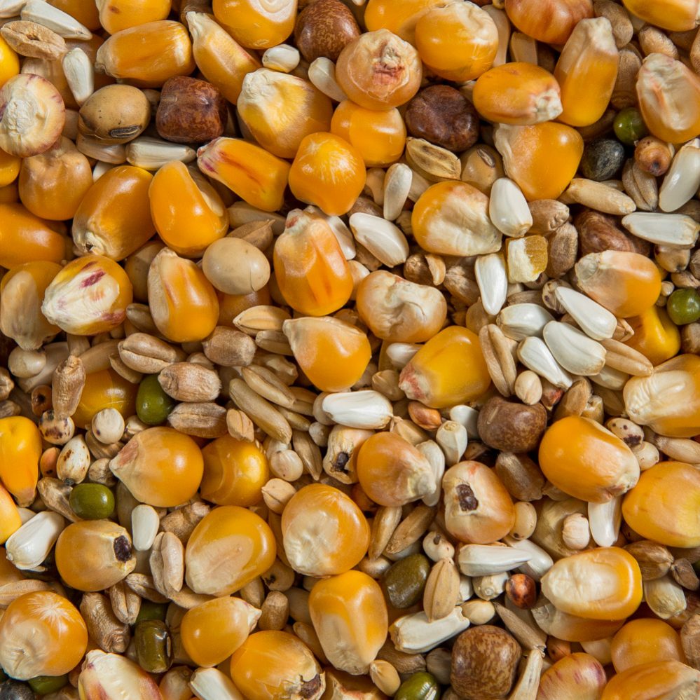 Small round corn, white milo, safflower, groats, red milo, vitaminized groats, paddy rice, toasted soybeans, maple peas, mung beans, vetch, canola.