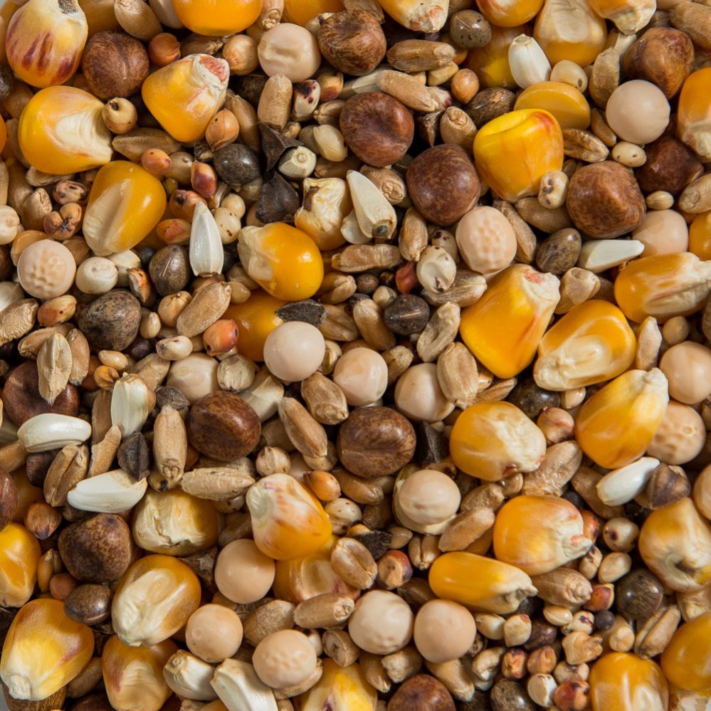 Small round corn, trapper peas, cut wheat, maple peas, red milo, white milo, canola, white millet, safflower, buckwheat, vetch.