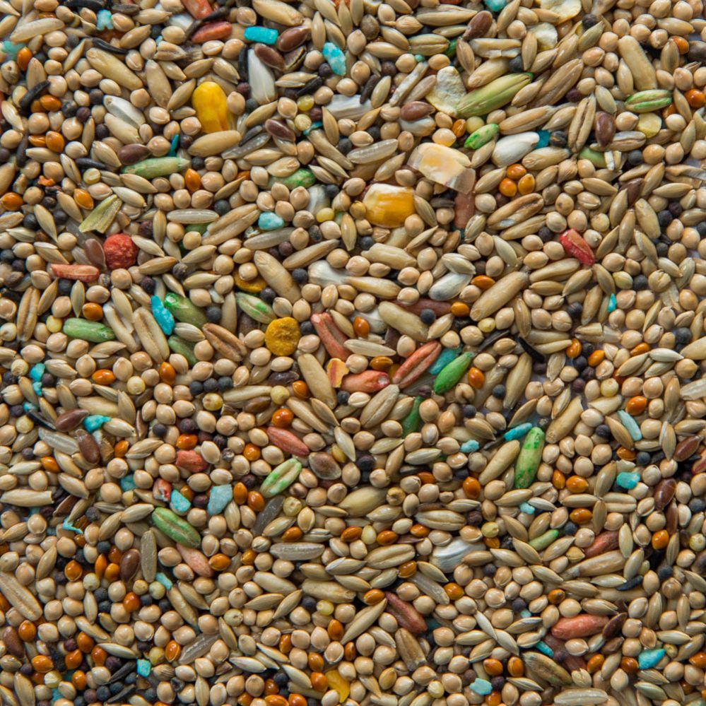 White millet, canary, golden German millet, vitaminized groats, colored groats, green millet, Japanese millet, canola, red millet, safflower, cracked corn, coconut, long brown rice, hemp, flax seed, Nyjer, small pellets.